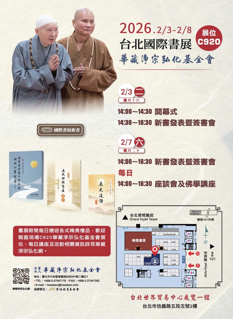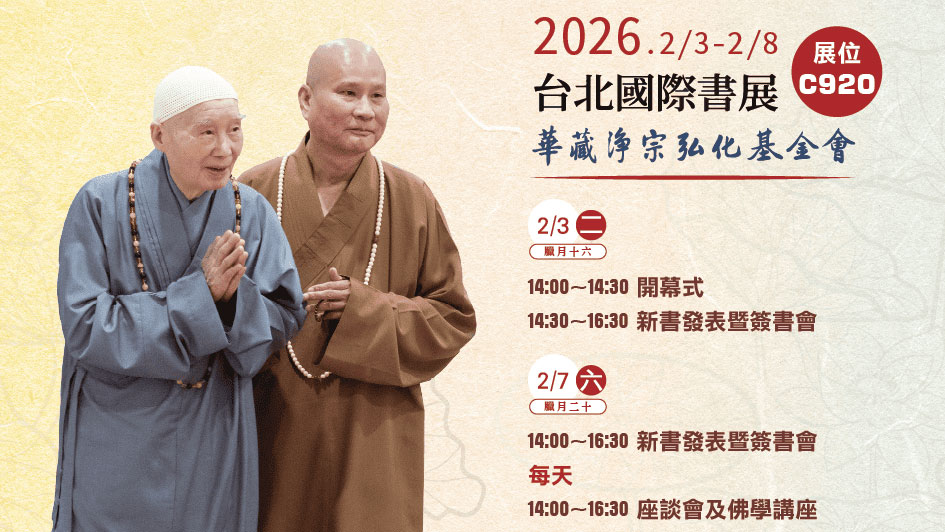 2026台北國際書展於 2/3(二)~2/8(日)在台北世貿一館展出,華藏淨宗弘化基金會/華藏淨宗學會再次參展,展位在C920,學會多年來致力於佛教典籍的整理及流通,幫助大家更容易了解佛法,並通過修習佛法獲得更有品質的生活,身心輕安喜悅,這也是我們這次參加書展的願望。